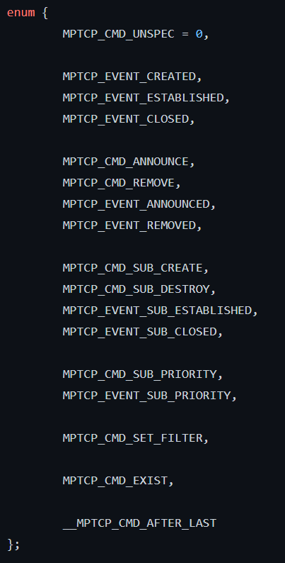 API 문서에서 살펴보면 MPTCP(v0.95)의 Netlink PM은 다음과 같은 Commands와 Events를 제공한다.