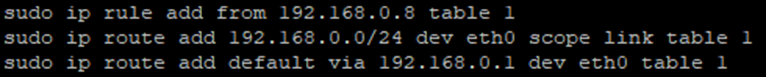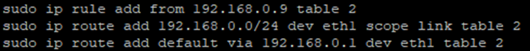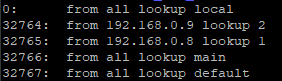 최종적으로 ip rule show 명령어를 통해 확인한 결과 192.168.0.8의 Source IP를 가지는 패킷은 table 1의 정책이 결정된 것과 192.168.0.9의 Source IP를 가지는 패킷은 table 2의 정책이 결정된 것을 확인할 수 있다.