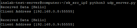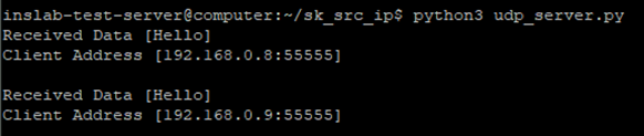 앞선 실험과 마찬가지로 클라이언트측 UDP 통신 프로그램에서 192.168.0.8과 192.168.0.9의 Source 주소를 통해 "Hello"라는 메시지를 서버측(192.168.0.10) UDP 통신 프로그램으로 송신하는 동작을 수행하였고, 서버측 또한 마찬가지로 192.168.0.8과 192.168.0.9에서 전달된 "Hello" 메시지를 전송받은 것을 확인할 수 있다.
