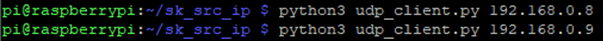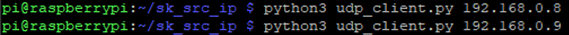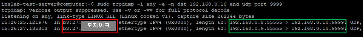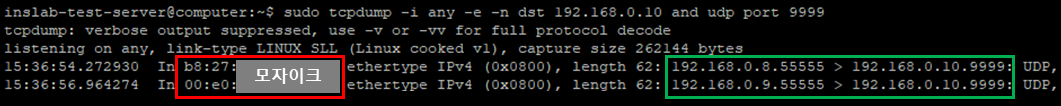 tcpdump를 통해 클라이언트와 서버간에 발생된 UDP 패킷을 캡처해보면 알 수 있듯이 192.168.0.8과 192.168.0.9 주소에서 발생된 메시지가 모두 클라이언트의 b8:27:로 시작하는 eth0 NIC를 통해 통신하는 것을 확인할 수 있다.