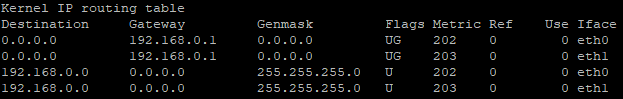위 테이블을 통해 알 수 있는 것은 "192.168.0.0 네트워크나 192.168.0.0이 아닌 네트워크로 통하는 데이터(패킷)들은 모두 Metric(값이 낮을 수록 높은 우선순위를 가짐)이 낮은 eth0을 통해 라우팅 된다" 이다.
