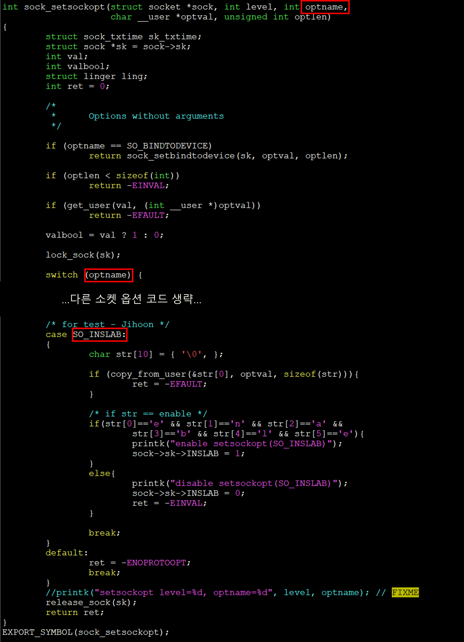 필자는 optname으로 SO_INSLAB(22)이 입력되었을 경우 optval의 값을 검사해 "enable"인 경우 sock 구조체의 INSLAB 변수를 1로 flag 시키고 아니면 INSLAB을 0으로 flag 시키도록 하였다.