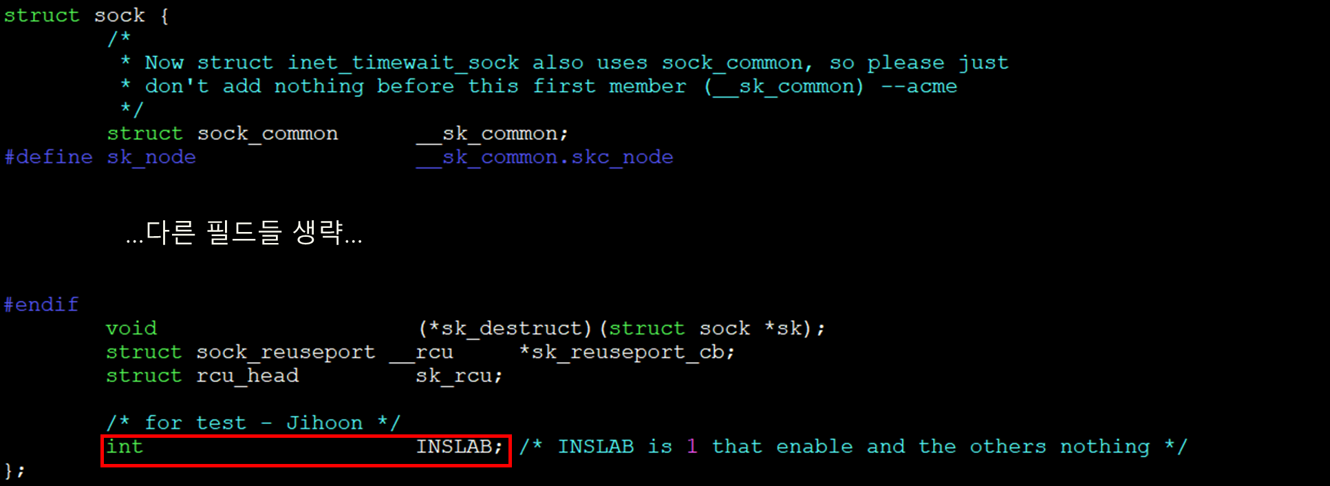 미리 sock 구조체에 INSLAB 이라는 int형 변수를 선언해두어서 위 코드를 실행할 수 있는 것이다.