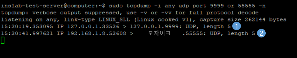 해당 코드의 실행 결과는 아래와 같으며 tcpdump를 통해 시스템 내부에서 진행되는 udp 패킷을 캡처한 것이다.