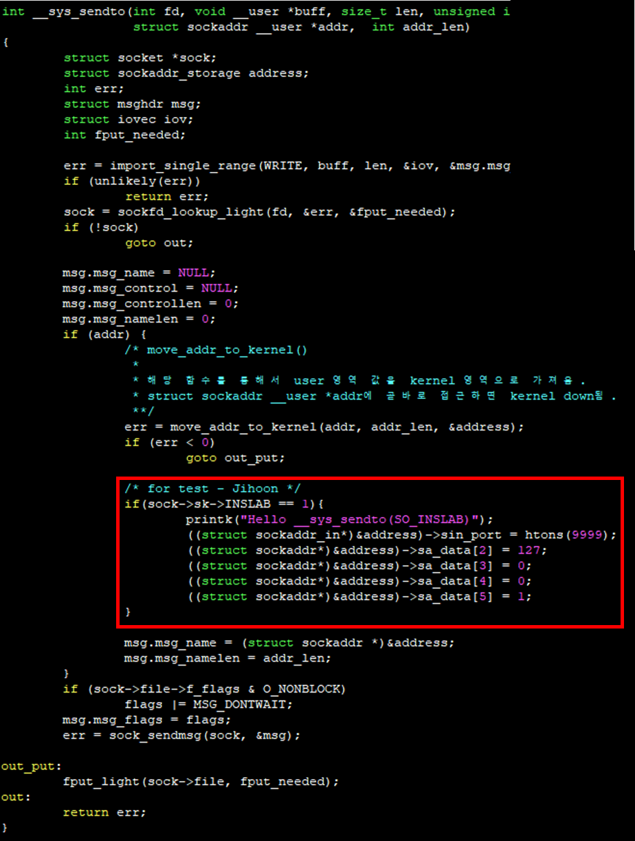 다시 말해 필자는 sock 구조체의 INSLAB 값이 1로 flag된 소켓이 __sys_sendto()를 호출할 시 빨간 박스와 같이 목적지 주소를 127.0.0.1로 변환하는 커널 코드를 구현하였다.