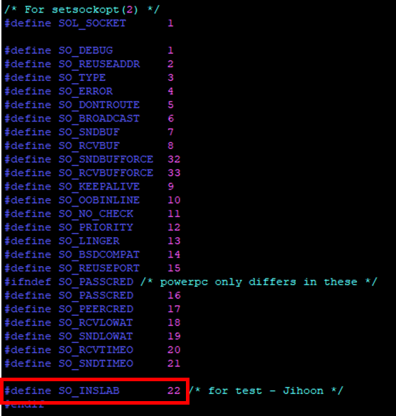 필자는 SO_INSLAB이라는 22번 소켓 옵션을 추가하였다.
