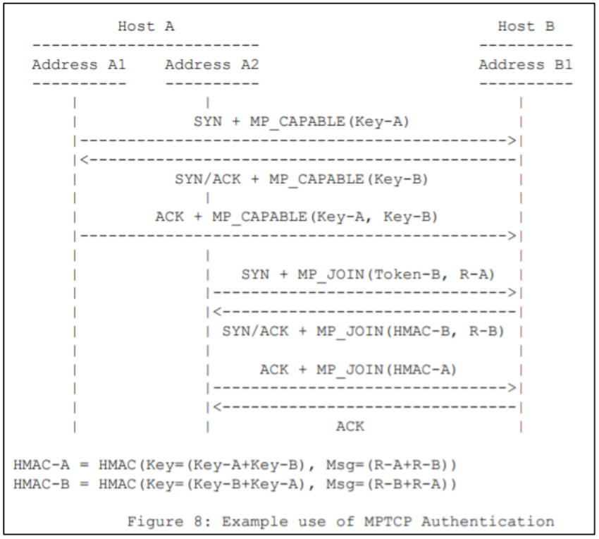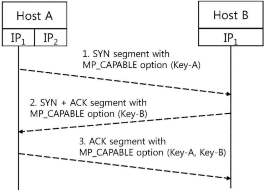 MPTCP 초기 연결 시에 두 호스트 간에는 암호화 알고리즘을 활용해 Key를 나눠 갖는다.