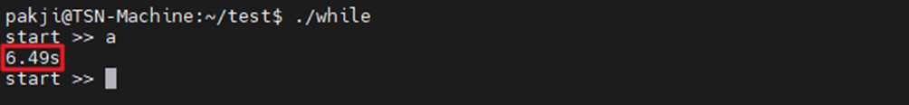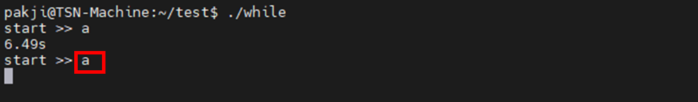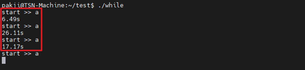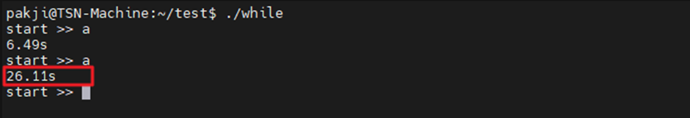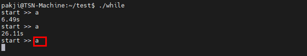 5. 터미널 1에서 while 바이너리가 실행되었다면, start >> 프롬프트가 뜰 것이다. 해당 프롬프트에서 알파벳 a~z를 입력해주면 10개의 Sub Thread가 실행된 뒤 연산을 수행하고 모든 Sub Thread가 종료된 시간을 출력해준다.