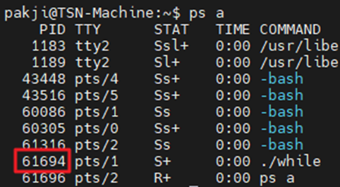 2. 터미널 2에서 실행된 while 바이너리의 Process ID 확인