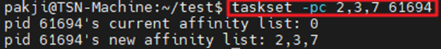 12. 터미널 2에서 다시 taskset 명령을 통해 Process에 2, 3, 7 번째 Index에 위치한 CPU Core를 할당