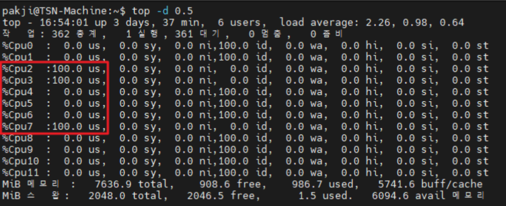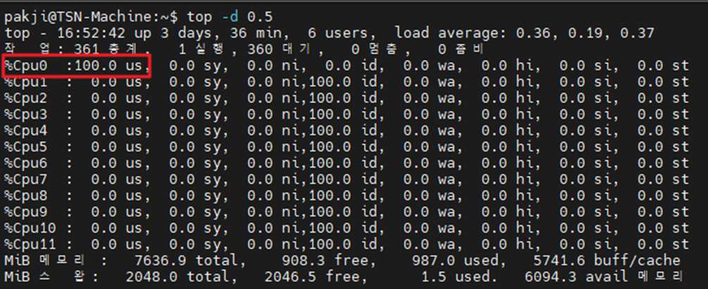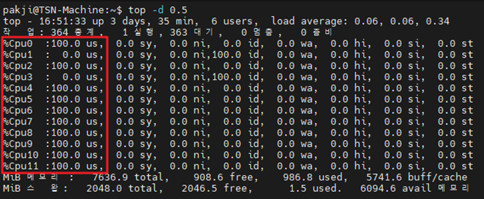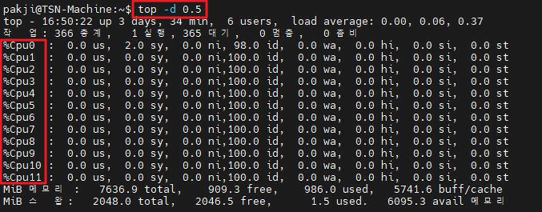 4. 터미널 3에서 top 명령을 통해 각 CPU Core 별 점유율을 0.5초 간격으로 조회