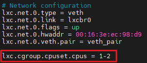 아래는 LXC에 특정 CPU Core를 할당시키기 위한 변수를 추가한 내용을 캡처한 것이다.
