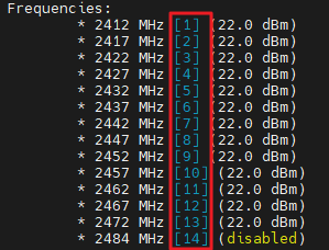 결과를 보면, 필자의 컴퓨터에 부착되어있는 WIFI 인터페이스는 2.4GHz 대역에서 사용가능한 채널 번호는 1~13번임을 확인할 수 있으며 14번은 사용하지 못하는 상태임을 알 수 있다.