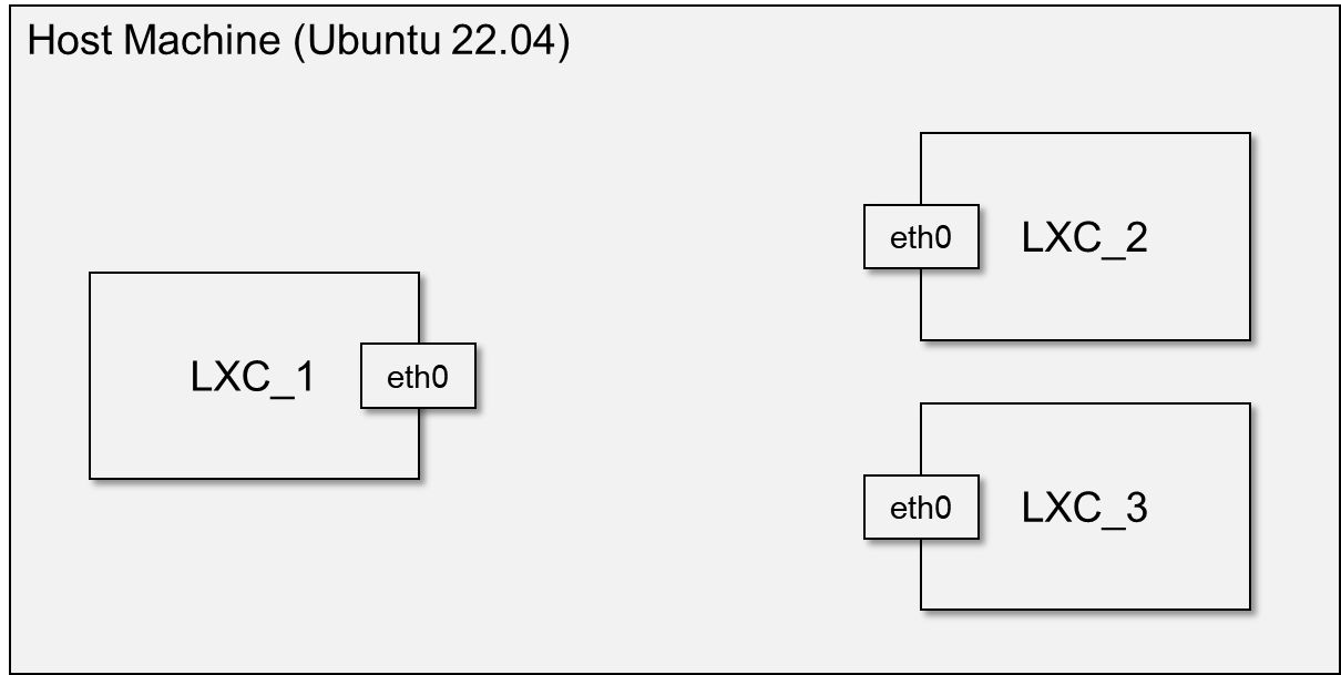 LXC 관련 패키지를 Host 머신에 설치하였으면, 이제 위 그림과 같은 토폴로지 셋팅을 위해 3개의 LXC를 Host 머신에 올려주면 된다.